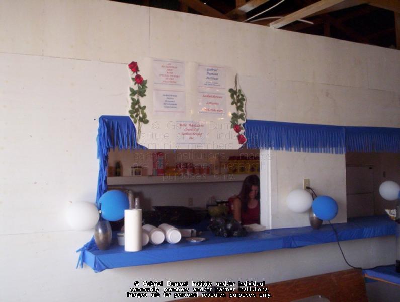 Description: Booth at Back to Batoche, 2004, with sign thanking sponsors.