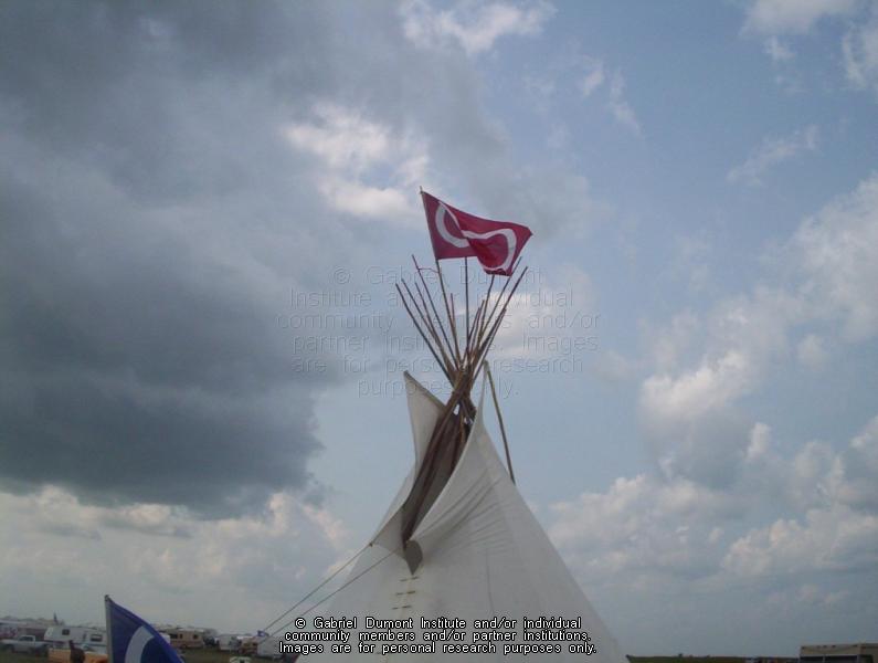 | Description: | Tipi with Métis flag, camp grounds at Back to Batoche, 2004.
