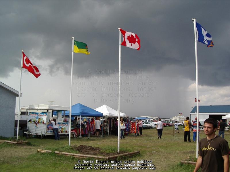 | Description: | Canadian flag, Saskatchewan flag and Métis flags flying at Back to Batoche, 2004. |