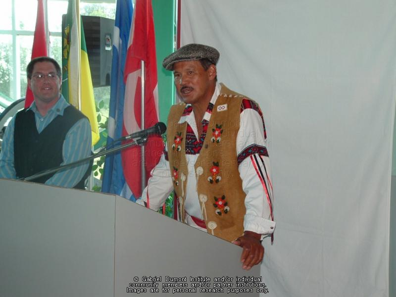 Description: Bruce Dumont at podium, unveiling of a billiards table attributed to Gabriel Dumont, Back to Batoche, 2006.
