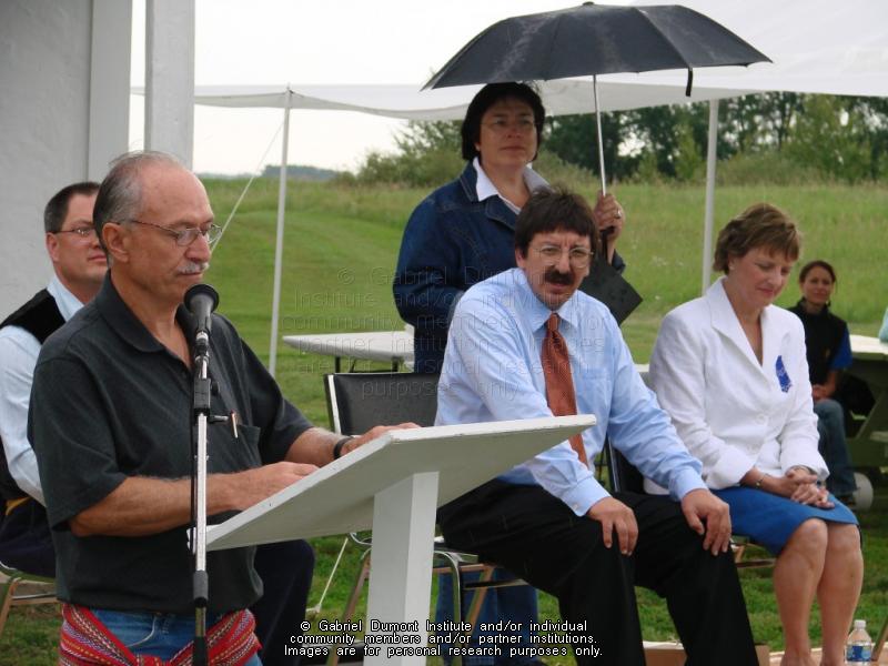 Ronald Caron giving speech at opening of Caron Home, Back to Batoche 2007. Karon Shmon, Robert Doucette and the Honourable Carol Skelton are in background.