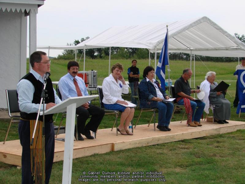 Marc Calette at opening of Caron Home, Back to Batoche 2007. Robert Doucette, the Honourable Carol Skelton, Karon Shmon, Ronald Caron and Rose Fleury seated in the background.