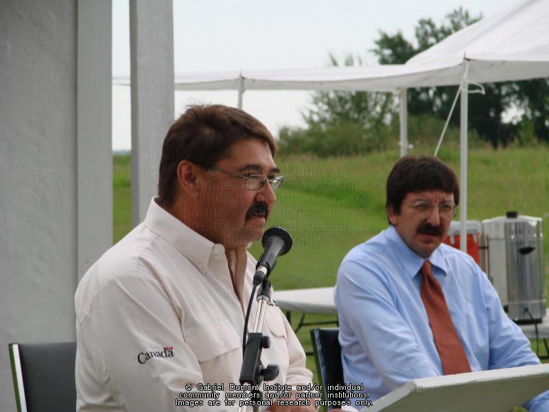 Description: Ray Fiddler at opening of Caron Home, Back to Batoche, 2007. Robert Doucette in background.