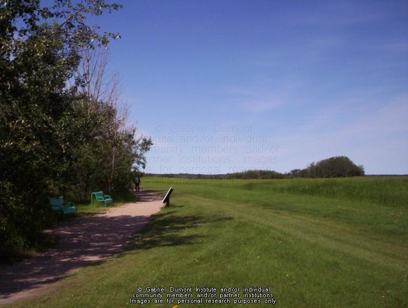 Walking trail from main building towards church and rectory at Batoche National Historic Site. Image taken during the Aboriginal Literacy Festival, 2005. |