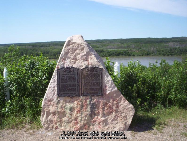 Grave site and monument of Gabriel Dumont overlooking the South Saskatchewan River. Image taken at the Aboriginal Literacy Festival, 2005. |