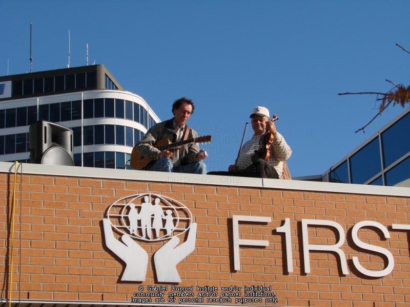 John Arcand and Freddie Pelletier on the First Sask Credit Union roof as part of a fundraiser, Fiddler on the Roof, for a permanent roof over the main stage at the John Arcand Fiddle Fest. |