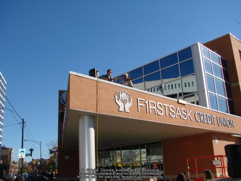 John Arcand and Freddie Pelletier on the First Sask Credit Union roof as part of a fundraiser, Fiddler on the Roof, for a permanent roof over the main stage at the John Arcand Fiddle Fest. |