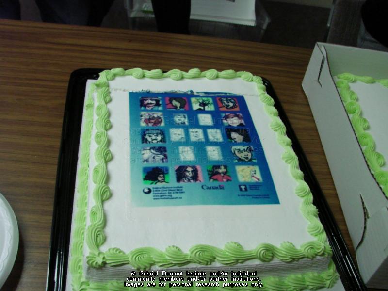 Cake with back cover image from Stories of Our People at the launch of Stories of Our People at the Carlyle King Branch, Saskatoon Public Library, October 2008. |