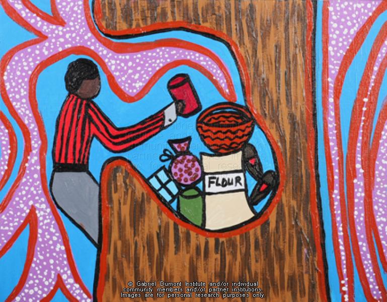 | Description: | This is an illustration by Leah Dorion entitled "Reaching for Sugar." This image will appear in the forthcoming Gabriel Dumont Institute publication, "The Great Giving Tree: A Traditional Métis Story of Giving and Receiving." This charming story, steeped in Métis culture, focuses on the boyhood reminisces of Mushoom as he describes finding the “great giving tree” with his mother and father. This vibrantly illustrated children’s book is a beautiful retelling of a traditional Métis story. Both Leah and the Gabriel Dumont Institute are very happy to share this story with the Métis and larger communities since it emphasizes Métis core values and beliefs including strength, kindness, courage, tolerance, honesty, respect, love, sharing, caring, balance, patience, and most of all the important connection with the Creator and Mother Earth. This resource will also include Métis values charts, a glossary and an accompanying narration CD in English and Michif.