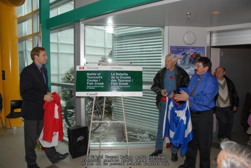 | Description: | Member of Parliament Brad Trost, Nation Senator John Boucher and Métis Nation—Saskatchewan President Robert Doucette at Louis Riel and Métis Veterans Day, unveiling of new sign for Fish Creek/Tourond’s Coulee. |