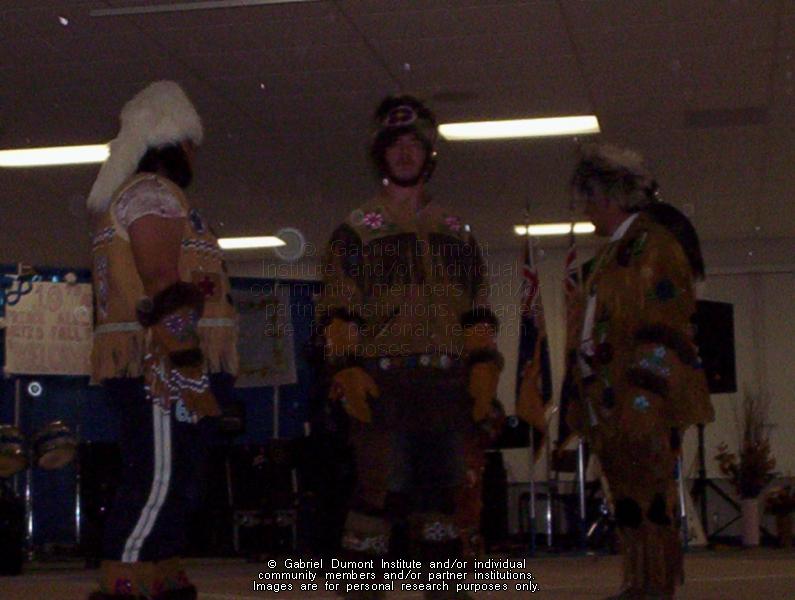 | Description: | Three men wearing traditional clothing on stage at Prince Albert Métis Fall Festival. |