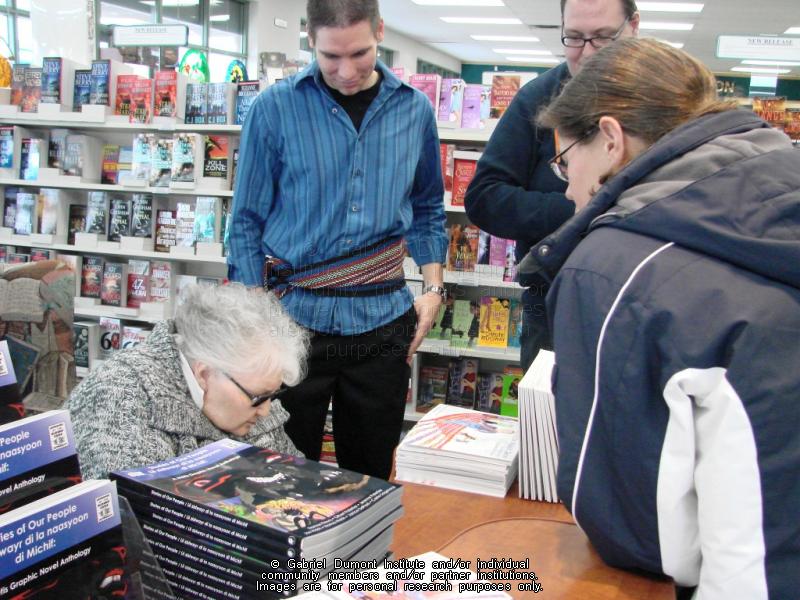 Jean Pelletier signing copies of Stories of Our People: A Métis Graphic Novel Anthology and The Story of the Rabbit Dance. David Morin and Darren Prefontaine in background. |