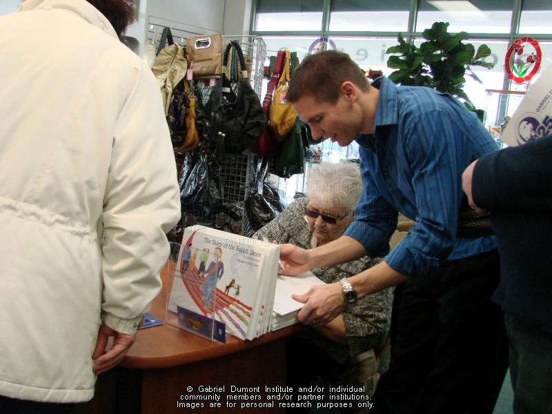 | Description: | David Morin signing a copy of Stories of Our People: A Métis Graphic Novel Anthology at book launch. |