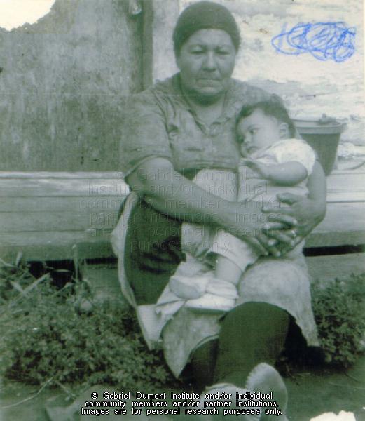 Jimmy Norman carried by his grandmother Eliza Merasty. This image is to be used for research purposes only. The reproduction of this image in whole or in part is strictly prohibited without the permission of the copyright holder. Copyright for this image belongs to Lawrence Arnault, and/or the person(s) in the photograph, and/or their descendants. |