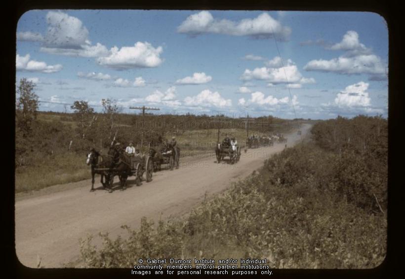 Indians returning from St. Laurent pilgrimage. This image has been graciously provided by the Saskatchewan History and Folklore Society, through executive director Finn Andersen, for use on this website, and is to be used for research purposes only. The reproduction of this image in whole or in part is strictly prohibited without the permission of the copyright holder. |