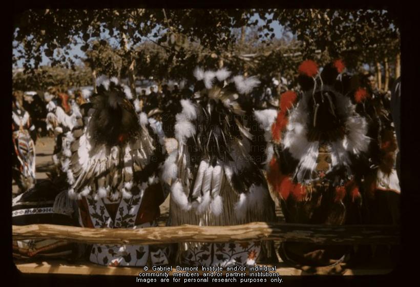 Ceremonial head dress from the rear, Sioux pow wow. This image has been graciously provided by the Saskatchewan History and Folklore Society, through executive director Finn Andersen, for use on this website, and is to be used for research purposes only. The reproduction of this image in whole or in part is strictly prohibited without the permission of the copyright holder. |