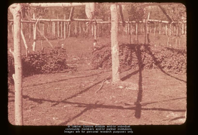 Interior--thirst dance lodge. This image has been graciously provided by the Saskatchewan History and Folklore Society, through executive director Finn Andersen, for use on this website, and is to be used for research purposes only. The reproduction of this image in whole or in part is strictly prohibited without the permission of the copyright holder. |