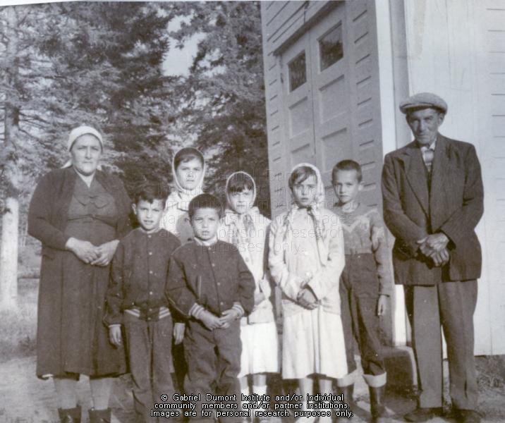 The adults are Albertine Laliberte (1903-1973) and her brother in law Norbert Laliberte (1888-1974). The children in the back row are Marie Gardiner, Rose Gardiner, Marlene Laliberte and Archie (Hoppy) Laliberte. The two boys in the front are Joe Gardiner and Henry Gardiner. The Gardiners were grandchildren of Albertine. This image is to be used for research purposes only. The reproduction of this image in whole or in part is strictly prohibited without the permission of the copyright holder. Copyright for this image belongs to Lawrence Arnault, and/or the person(s) in the photograph, and/or their descendants. |