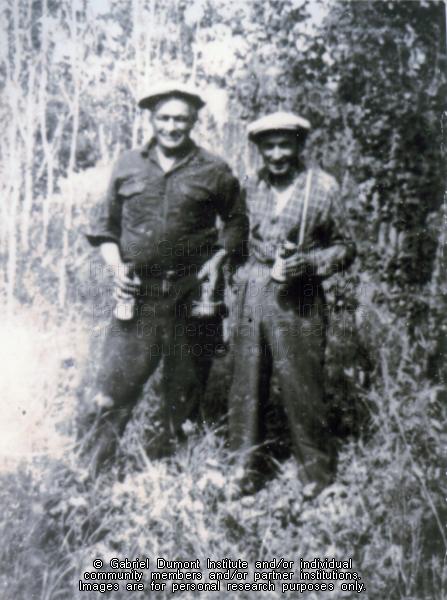 Cyril Morin and Bruno Martel. Cyril was a brother to Alex Morin. Bruno was from Waterhen Lake First Nation. This image is to be used for research purposes only. The reproduction of this image in whole or in part is strictly prohibited without the permission of the copyright holder. Copyright for this image belongs to Lawrence Arnault, and/or the person(s) in the photograph, and/or their descendants. |