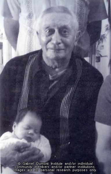 Wayne Bundschuh being carried by his great, great grandfather Bill Fiddler (1889-1972). The reproduction of this image in whole or in part is strictly prohibited without the permission of the copyright holder. Copyright for this image belongs to Lawrence Arnault, and/or the person(s) in the photograph, and/or their descendants.  |
