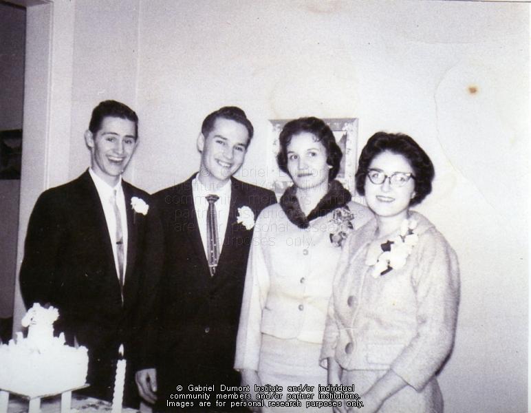 Second lady from right, Marie (Arnault) Lamers. She was the daughter of Fred Arnault and Rosa Lafond of Dorintosh, SK and a sister to Charles Arnault of Green Lake. Her husband was Lloyd Lamers. This photograph is possibly of their wedding. This image is to be used for research purposes only. The reproduction of this image in whole or in part is strictly prohibited without the permission of the copyright holder. Copyright for this image belongs to Lawrence Arnault, and/or the person(s) in the photograph, and/or their descendants. |