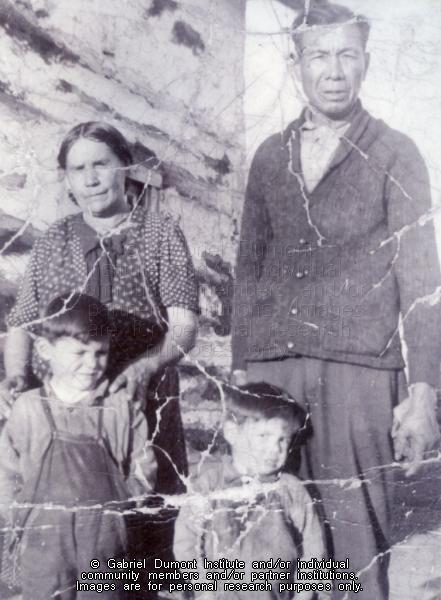 | Description: | The two boys are Max and William Bear of Flying Dust First Nation, standing with their paternal grandparents Maglorie Bear and Mary Blackstar. Max and William were the sons of Baptist Bear.