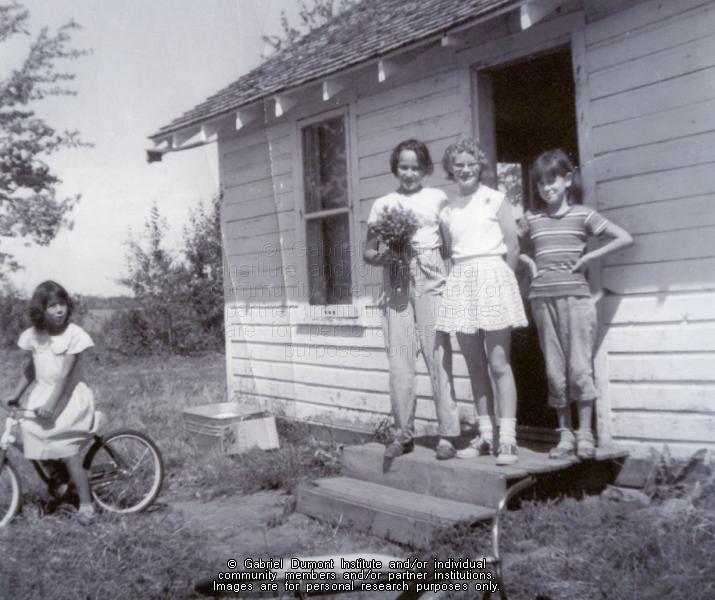 The young girl on the bike is Lucina Laliberte and the girl on the steps closest to her is her sister Marilyn. They were the children of Joe A. Laliberte and Marie Louise Roy of Green Lake, SK. The other two girls are unknown. This image is to be used for research purposes only. The reproduction of this image in whole or in part is strictly prohibited without the permission of the copyright holder. Copyright for this image belongs to Lawrence Arnault, and/or the person(s) in the photograph, and/or their descendants. |