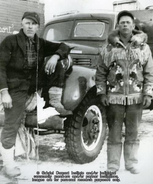 Description: John Sergew (left) of Goodsoil, SK stands with Max Fiddler (1912-1982) of Meadow Lake, SK. This image is to be used for research purposes only. The reproduction of this image in whole or in part is strictly prohibited without the permission of the copyright holder. Copyright for this image belongs to Lawrence Arnault, and/or the person(s) in the photograph, and/or their descendants.