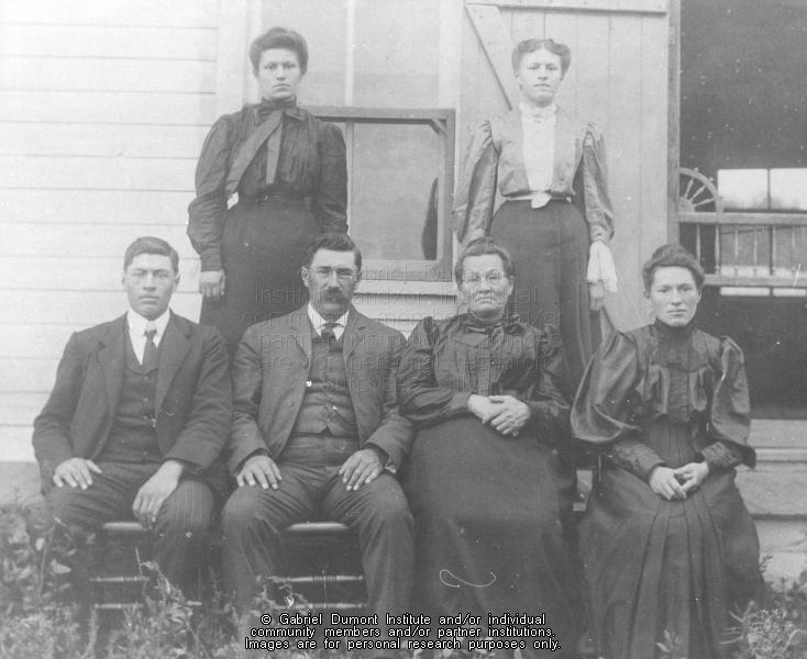 | Description: | This a photograph of the Joachim Perreault—Alfred, Joachim, Mathilde (née Carrière), Cléophée (font), Rose Anna and Malvina (rear). Rose Anna Perreault was the daughter of Mathilde Carrière who was in turn the daughter of André Carrière and Angèlique Dion. André Carrière was descended from Jeanne Nipissing while Angèlique`s mother is recorded as ``une femme Cree.``