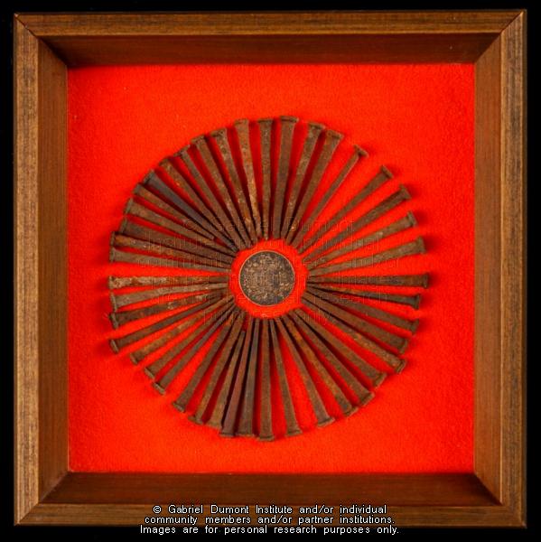 This image (by Peter Beszterda) is of a 6`` x 6`` vertical display of nails taken from the St. Antoine de Padoue Church at Batoche. They were collected by Dennis and Jean Fisher and their sons in late 1960s or early 1970s. They are part of the Dennis and Jean Fisher Collection. This collection contains archaeological artifacts taken from the battlefields of the 1885 Resistance as well as Fort Pitt (Saskatchewan), Cumberland House (Saskatchewan) and St. Peter’s Mission, Montana. The collection also includes various artifacts and ephemera relating to the 1885 Resistance and Gabriel Dumont. |