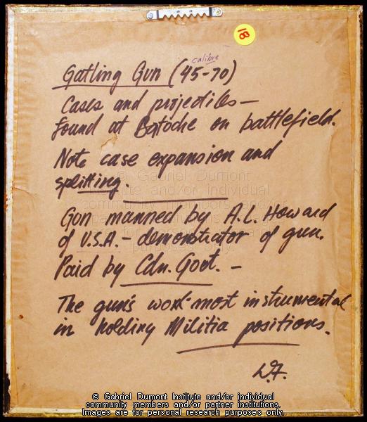 | Description: | This image (by Peter Beszterda) is of the back of a 6`` x 6`` display of Gatling Gun shell casings. This text contains information relating to the calibre of the Gatling Gun shells as well as other details. They are part of the Dennis and Jean Fisher Collection. This collection contains archaeological artifacts taken from the battlefields of the 1885 Resistance as well as Fort Pitt (Saskatchewan), Cumberland House (Saskatchewan) and St. Peter’s Mission, Montana. The collection also includes various artifacts and ephemera relating to the 1885 Resistance and Gabriel Dumont. |