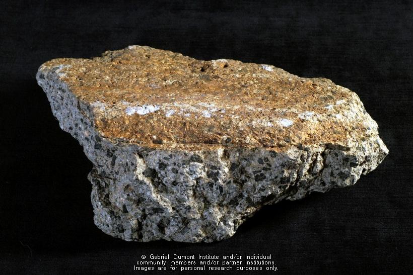 This image (by Peter Beszterda) is of one of three stone fragments collected from St. Peter's Mission School in Montana. Louis Riel taught at this mission in the mid-1880s. They were collected by Dennis and Jean Fisher and their sons in 1974. They are part of the Dennis and Jean Fisher Collection. This collection contains archaeological artifacts taken from the battlefields of the 1885 Resistance as well as Fort Pitt (Saskatchewan), Cumberland House (Saskatchewan) and St. Peter's Mission, Montana. The collection also includes various artifacts and ephemera relating to the 1885 Resistance and Gabriel Dumont. |