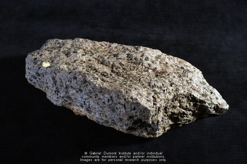 This image (by Peter Beszterda) is of one of three stone fragments collected from St. Peter's Mission School in Montana. Louis Riel taught at this mission in the mid-1880s. They were collected by Dennis and Jean Fisher and their sons in 1974. They are part of the Dennis and Jean Fisher Collection. This collection contains archaeological artifacts taken from the battlefields of the 1885 Resistance as well as Fort Pitt (Saskatchewan), Cumberland House (Saskatchewan) and St. Peter's Mission, Montana. The collection also includes various artifacts and ephemera relating to the 1885 Resistance and Gabriel Dumont. |