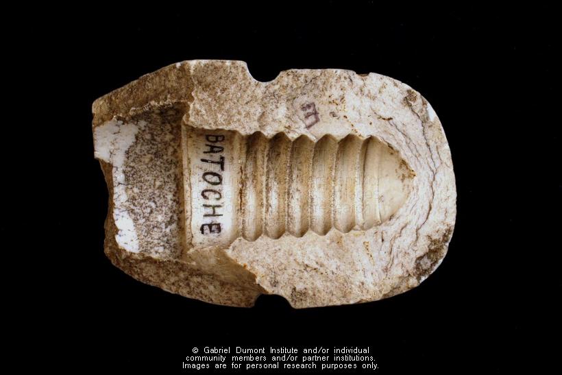 This image (by Peter Beszterda) is of a ceramic telegraph insulator from Batoche and was part of the Humboldt-Batoche telegraph line that was cut by Dumont's forces in 1885. It is part of the Dennis and Jean Fisher Collection. This collection contains archaeological artifacts taken from the battlefields of the 1885 Resistance as well as Fort Pitt (Saskatchewan), Cumberland House (Saskatchewan) and St. Peter’s Mission, Montana. The collection also includes various artifacts and ephemera relating to the 1885 Resistance and Gabriel Dumont. |