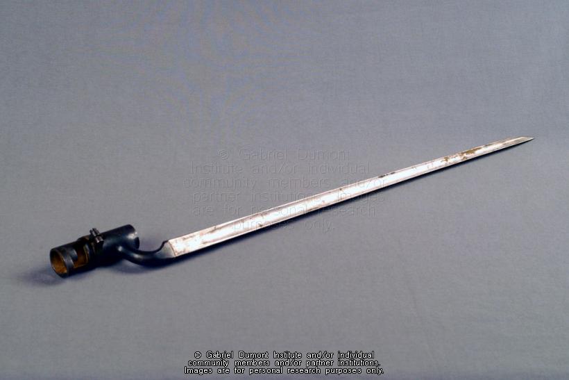 This image (by Peter Beszterda) is of one of two .577 Enfield-Snider triangular model bayonets (and/or sheath) from the Dennis and Jean Fisher Collection. This collection contains archaeological artifacts taken from the battlefields of the 1885 Resistance as well as Fort Pitt (Saskatchewan), Cumberland House (Saskatchewan) and St. Peter’s Mission, Montana. The collection also includes various artifacts and ephemera relating to the 1885 Resistance and Gabriel Dumont. |
