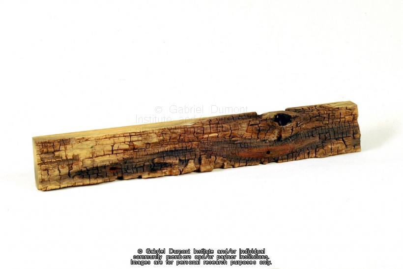 This image (by Peter Beszterda) is one of three wooden planks from the SS Northcote that was beached at Cumberland House following the 1885 Resistance. The image pictured is the smaller of two pieces donated by Dennis and Jean Fisher in 2010. These wooden planks were collected by Dennis, Dennis Jr. and David Fisher in 1971 at Cumberland House, Saskatchewan. They are part of the Dennis and Jean Fisher Collection. This collection contains archaeological artifacts taken from the battlefields of the 1885 Resistance as well as Fort Pitt (Saskatchewan), Cumberland House (Saskatchewan) and St. Peter’s Mission, Montana. The collection also includes various artifacts and ephemera relating to the 1885 Resistance and Gabriel Dumont. |