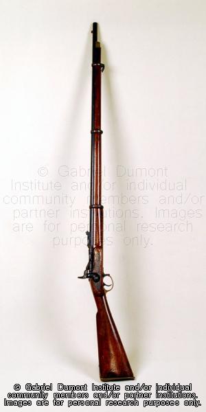 This image (by Peter Beszterda) is of a .577 Enfield-Snider Patent Rifle. This type of rifle was used by the North West Field Force during the 1885 Resistance. It was donated to the Institute in 2011 by Dennis and Jean Fisher. It is part of the Dennis and Jean Fisher Collection. This collection contains archaeological artifacts taken from the battlefields of the 1885 Resistance as well as Fort Pitt (Saskatchewan), Cumberland House (Saskatchewan) and St. Peter’s Mission, Montana. The collection also includes various artifacts and ephemera relating to the 1885 Resistance and Gabriel Dumont. |
