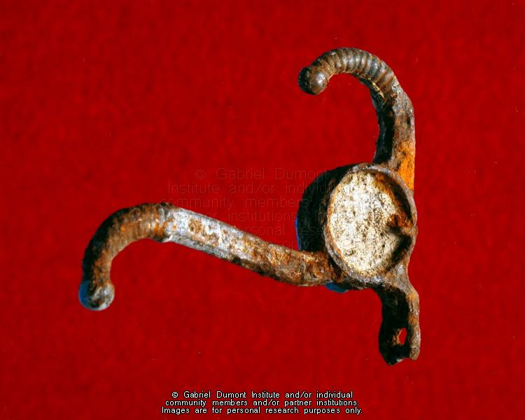 This image (by Peter Beszterda) is of a circular hanger taken from land that once belonged to Gabriel Dumont. It was collected by Dennis and Jean Fisher and their sons in the early 1970s. It is part of the Dennis and Jean Fisher Collection. This collection contains archaeological artifacts taken from the battlefields of the 1885 Resistance as well as Fort Pitt (Saskatchewan), Cumberland House (Saskatchewan) and St. Peter’s Mission, Montana. The collection also includes various artifacts and ephemera relating to the 1885 Resistance and Gabriel Dumont. |
