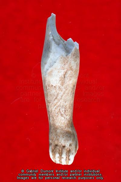This image (by Peter Beszterda) is of one of five porcelain doll fragments found at various locations in Batoche by Dennis and Jean Fisher and their sons in the early 1970s. The fragments appear to be from two dolls since they include the parts of two torsos. The dolls are made of porcelain and one torso seems to indicate that it was made in Japan in 1885. The doll fragments are part of the Dennis and Jean Fisher Collection. This collection contains archaeological artifacts taken from the battlefields of the 1885 Resistance as well as Fort Pitt (Saskatchewan), Cumberland House (Saskatchewan) and St. Peter’s Mission, Montana. The collection also includes various artifacts and ephemera relating to the 1885 Resistance and Gabriel Dumont. |