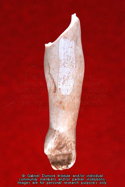 This image (by Peter Beszterda) is of one of five porcelain doll fragments found at various locations in Batoche by Dennis and Jean Fisher and their sons in the early 1970s. The fragments appear to be from two dolls since they include the parts of two torsos. The dolls are made of porcelain and one torso seems to indicate that it was made in Japan in 1885. The doll fragments are part of the Dennis and Jean Fisher Collection. This collection contains archaeological artifacts taken from the battlefields of the 1885 Resistance as well as Fort Pitt (Saskatchewan), Cumberland House (Saskatchewan) and St. Peter’s Mission, Montana. The collection also includes various artifacts and ephemera relating to the 1885 Resistance and Gabriel Dumont. |