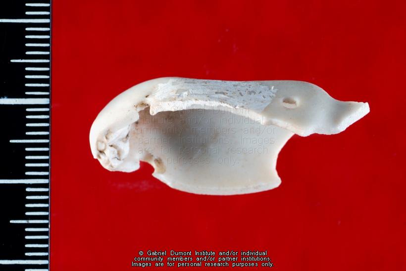 This image (by Peter Beszterda) is of one of five porcelain doll fragments found at various locations in Batoche by Dennis and Jean Fisher and their sons in the early 1970s. The fragments appear to be from two dolls since they include the parts of two torsos. The dolls are made of porcelain and one torso seems to indicate that it was made in Japan in 1885. The doll fragments are part of the Dennis and Jean Fisher Collection. This collection contains archaeological artifacts taken from the battlefields of the 1885 Resistance as well as Fort Pitt (Saskatchewan), Cumberland House (Saskatchewan) and St. Peter’s Mission, Montana. The collection also includes various artifacts and ephemera relating to the 1885 Resistance and Gabriel Dumont. |