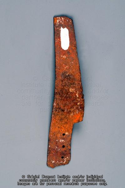 This image (by Peter Beszterda) is of a knife fragment from Batoche. It was collected by Dennis and Jean Fisher and their sons in the late 1960s or early 1970s. It is part of the Dennis and Jean Fisher Collection. This collection contains archaeological artifacts taken from the battlefields of the 1885 Resistance as well as Fort Pitt (Saskatchewan), Cumberland House (Saskatchewan) and St. Peter’s Mission, Montana. The collection also includes various artifacts and ephemera relating to the 1885 Resistance and Gabriel Dumont. |