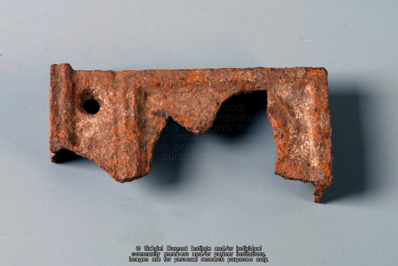 This image (by Peter Beszterda) is possibly a stove door fragment. It was collected by Dennis and Jean Fisher and their sons in the early 1970s. It is part of the Dennis and Jean Fisher Collection.This collection contains archaeological artifacts taken from the battlefields of the 1885 Resistance as well as Fort Pitt (Saskatchewan), Cumberland House (Saskatchewan) and St. Peter’s Mission, Montana. The collection also includes various artifacts and ephemera relating to the 1885 Resistance and Gabriel Dumont. |