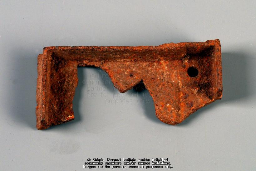 This image (by Peter Beszterda) is possibly a stove door fragment. It was collected by Dennis and Jean Fisher and their sons in the early 1970s. It is part of the Dennis and Jean Fisher Collection.This collection contains archaeological artifacts taken from the battlefields of the 1885 Resistance as well as Fort Pitt (Saskatchewan), Cumberland House (Saskatchewan) and St. Peter’s Mission, Montana. The collection also includes various artifacts and ephemera relating to the 1885 Resistance and Gabriel Dumont. |
