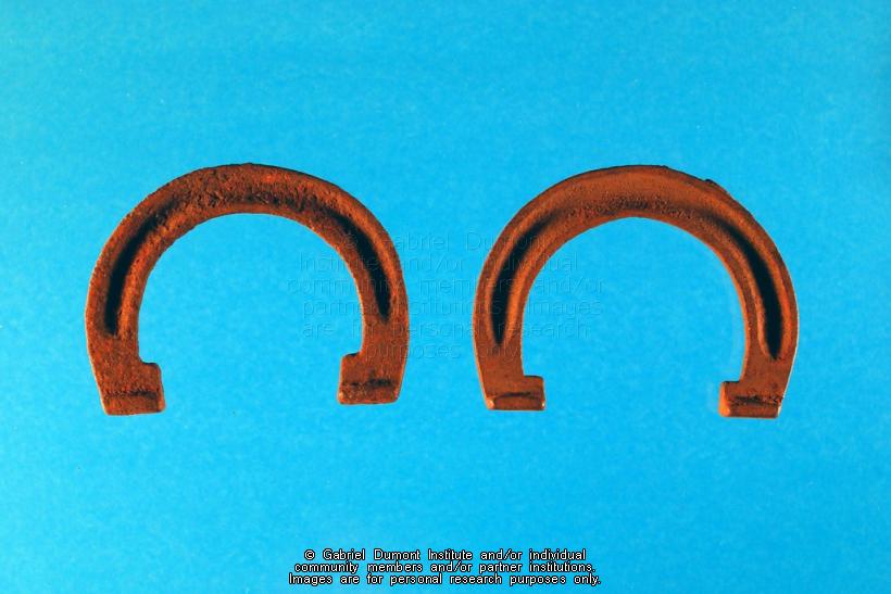 This image (by Peter Beszterda) is of horseshoe-like handles. They were collected by Dennis and Jean Fisher and their sons in the late 1960s or early 1970s from Batoche. They are part of the Dennis and Jean Fisher Collection. This collection contains archaeological artifacts taken from the battlefields of the 1885 Resistance as well as Fort Pitt (Saskatchewan), Cumberland House (Saskatchewan) and St. Peter’s Mission, Montana. The collection also includes various artifacts and ephemera relating to the 1885 Resistance and Gabriel Dumont. |