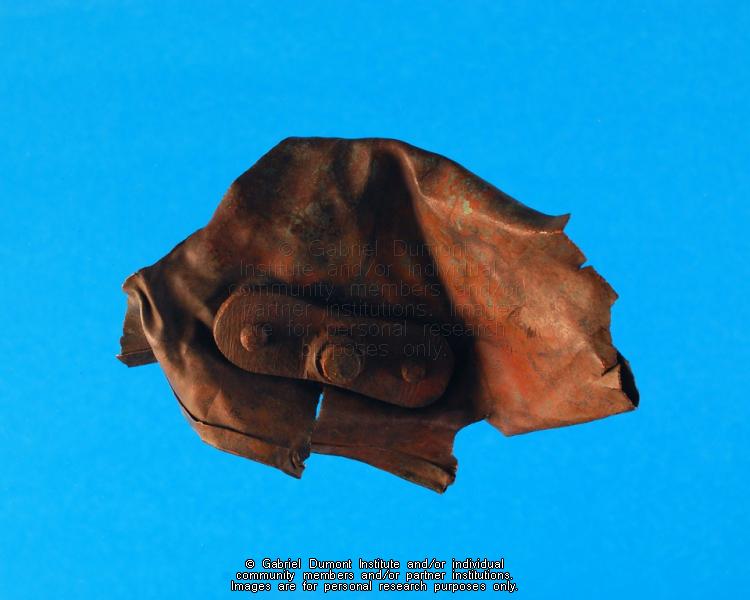 | Description: | This image (by Peter Beszterda) is of a copper pot fragment. It was collected by Dennis and Jean Fisher and their sons in 1975 on the Chenier Field at Batoche. It is part of the Dennis and Jean Fisher Collection. This collection contains archaeological artifacts taken from the battlefields of the 1885 Resistance as well as Fort Pitt (Saskatchewan), Cumberland House (Saskatchewan) and St. Peter’s Mission, Montana. The collection also includes various artifacts and ephemera relating to the 1885 Resistance and Gabriel Dumont. |
