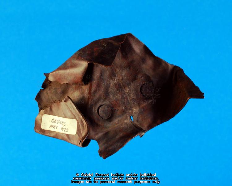 This image (by Peter Beszterda) is of a copper pot fragment. It was collected by Dennis and Jean Fisher and their sons in 1975 on the Chenier Field at Batoche. It is part of the Dennis and Jean Fisher Collection. This collection contains archaeological artifacts taken from the battlefields of the 1885 Resistance as well as Fort Pitt (Saskatchewan), Cumberland House (Saskatchewan) and St. Peter’s Mission, Montana. The collection also includes various artifacts and ephemera relating to the 1885 Resistance and Gabriel Dumont. |