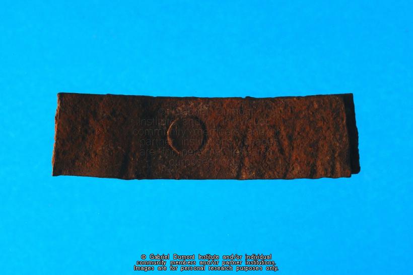 | Description: | This image (by Peter Beszterda) is of a HBC barrel rivet. It was collected by Dennis and Jean Fisher and their sons in the late 1960s or early 1970s from Batoche. It is part of the Dennis and Jean Fisher Collection. This collection contains archaeological artifacts taken from the battlefields of the 1885 Resistance as well as Fort Pitt (Saskatchewan), Cumberland House (Saskatchewan) and St. Peter’s Mission, Montana. The collection also includes various artifacts and ephemera relating to the 1885 Resistance and Gabriel Dumont. |
