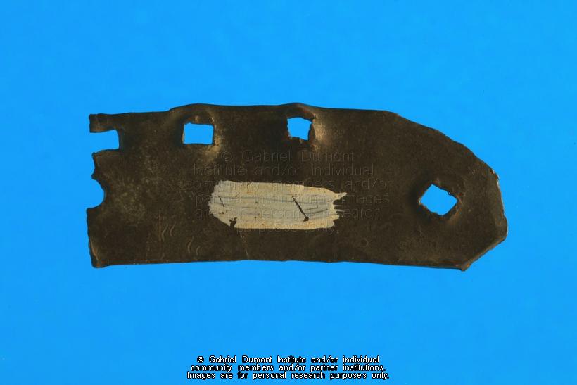 This image (by Peter Beszterda) is of a copper fragment that may have been used as side lock replacement for a firearm. It was collected by Dennis and Jean Fisher and their sons in the late 1960s or early 1970s from Batoche. It is part of the Dennis and Jean Fisher Collection. This collection contains archaeological artifacts taken from the battlefields of the 1885 Resistance as well as Fort Pitt (Saskatchewan), Cumberland House (Saskatchewan) and St. Peter’s Mission, Montana. The collection also includes various artifacts and ephemera relating to the 1885 Resistance and Gabriel Dumont. |