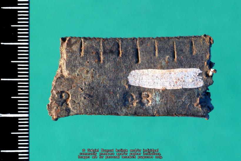 This image (by Peter Beszterda) is of a brass scale fragment collected from land once owned by Gabriel Dumont at Gabriel`s Crossing by Dennis and Jean Fisher and their sons in the late 1960s or early 1970s. It is part of the Dennis and Jean Fisher Collection. This collection contains archaeological artifacts taken from the battlefields of the 1885 Resistance as well as Fort Pitt (Saskatchewan), Cumberland House (Saskatchewan) and St. Peter’s Mission, Montana. The collection also includes various artifacts and ephemera relating to the 1885 Resistance and Gabriel Dumont. |